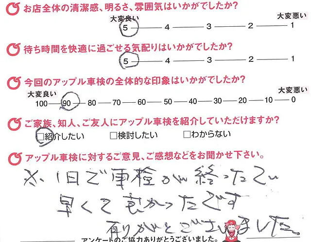 ※1日で車検が終わって早くて良かったです。有りがとうございました。