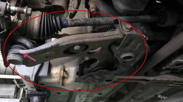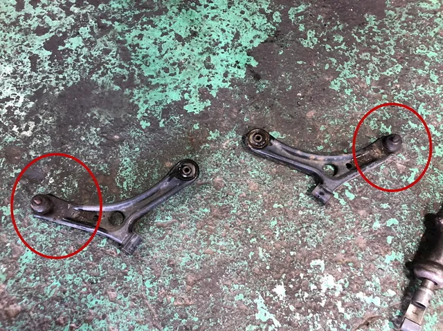 丸い枠の矢印部分にガタが生じていてボールジョイントといいます。この部分にガタがしょうじていると車検の継続はできません。この部分がガタによりぬけるとサスペンションごとタイヤが抜け落ちてしまうこともありうります。