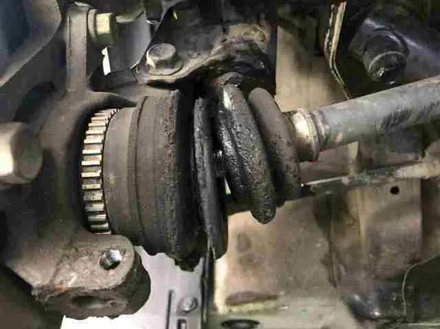 中心が破れ内部のシャフトグリースが飛散しているのがわかります。ブーツがやぶれグリースがないまま走行すると内部のベアリングが焼き付きをおこしハンドルを切って曲がっていくとかりかりかりかりかりと異音が発生する場合もあります。