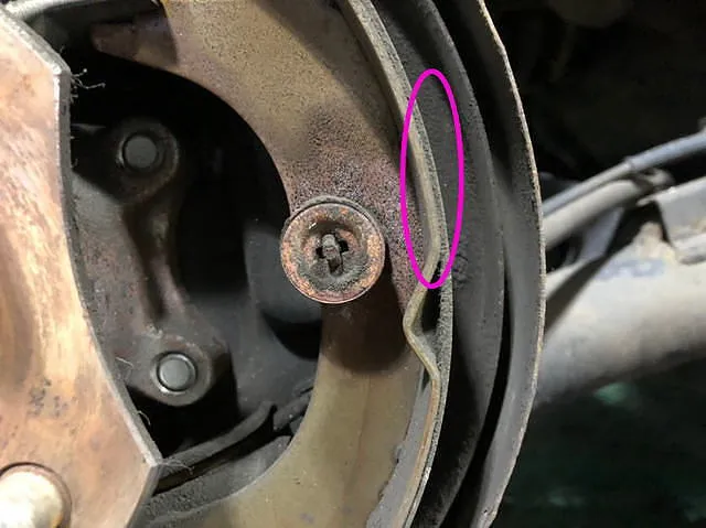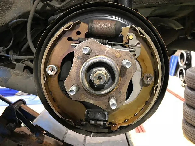 ブレーキの液漏れも確認、ブレーキホースのひび割れなど確認相手側のドラムも清掃し当たり面にペーパーをかけます。