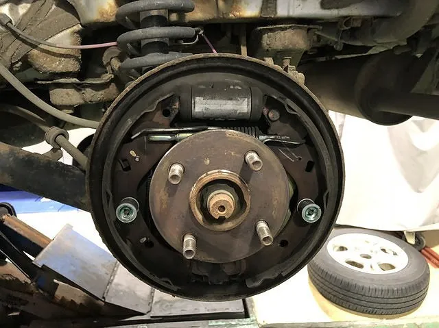 ドラムブレーキを分解、ブレーキの液漏れがないか、ブレーキホースの点検、当たり面をサンドペーパーで