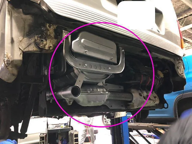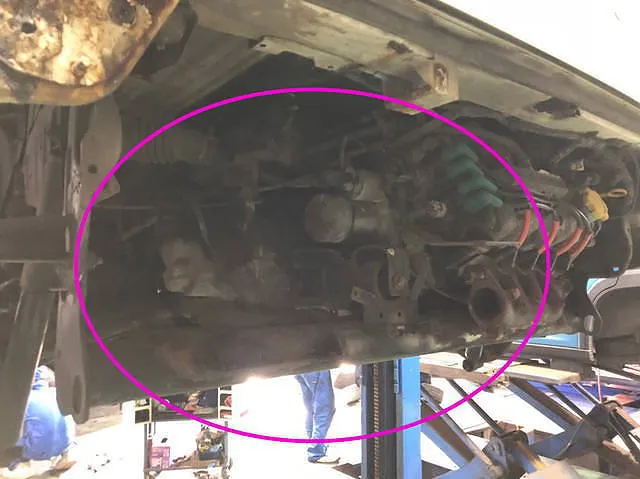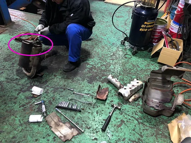 ピンクの丸印で囲っている部分はマフラーが付いている箇所です。今回マフラーも損傷により
