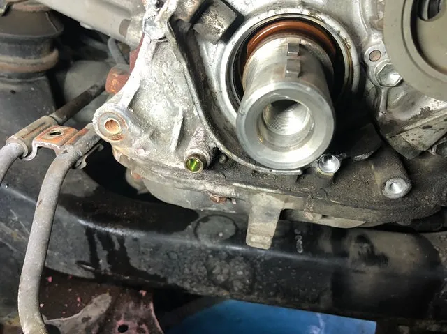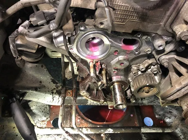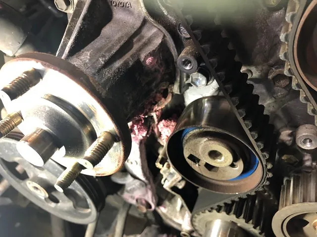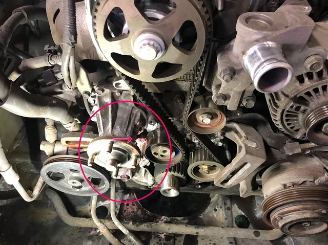 →の指している部分クーラント漏れが確認できます。ウオーターポンプはエンジンの冷却するクーラントを循環させる働きをします。またこの水温を利用して温風を(ヒーター)で熱電源をしています。