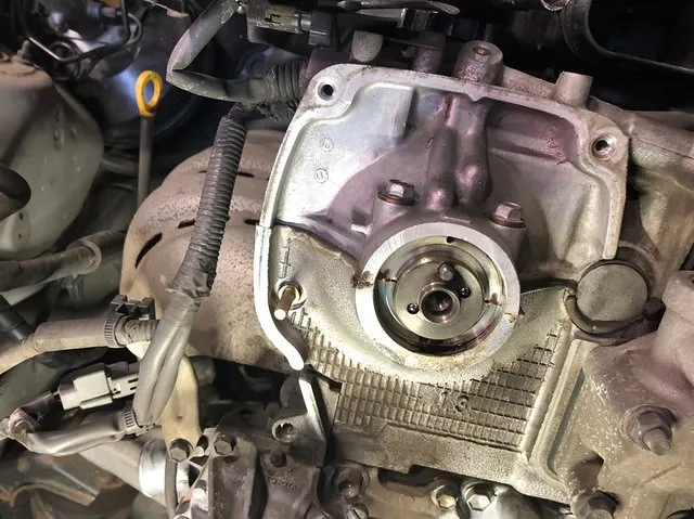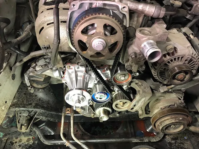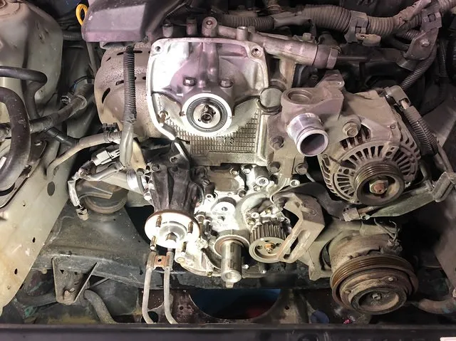 すっきりしました。洗浄もしましたのでキレイですね。ここまでくるのにクーラント抜き、ラジエーター外し、ファンベルト、パワステベルト、エアコンベルトを外し、カムシャフトプーリー、クランクシャフトプリー、タイミングベルトカバーを外し、タイミングベルトを外しここまできました