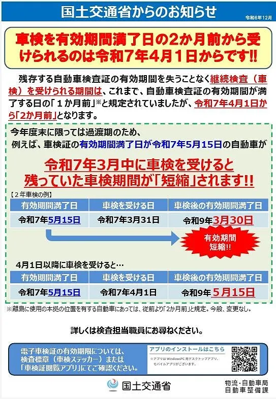 令和7年4月1日から、今まで車検満期1ヶ月前だと有効期限変わらず継続出来ていたものが、2ヵ月前から受けても車検の満了日は変わらないようになりました。