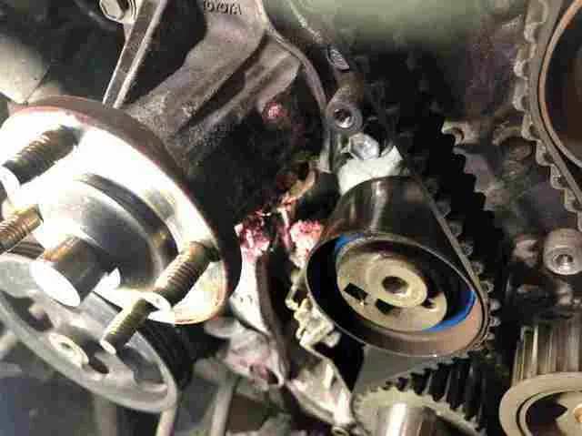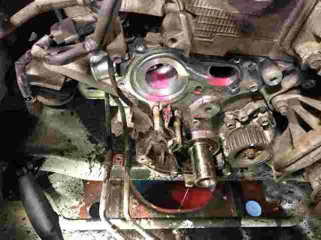 タイミングベルトを外しました。走行10万KM定期交換部品です。今回はウオーターポンプも交換します。これでクーラントの漏れも収まります。
