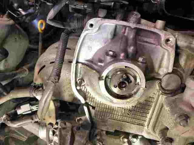 本体を外しました。ウオーターポンプはエンジンを冷やす冷却水を循環させる仕事をする部品です。