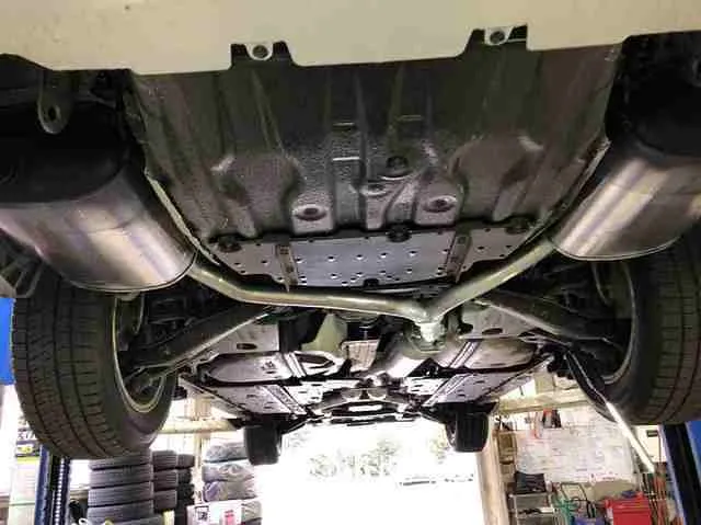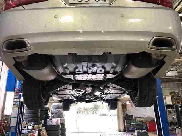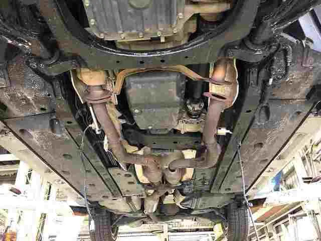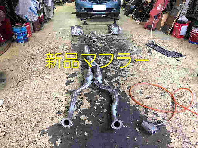 リフトアップしエンジン始動の上下部から排気漏れ部位を確認します。今回の場合溶接などで修理することが不可能でした。よって純正マフラーにて見積をご提示、ご相談の上お仕事のご依頼をいただきました。