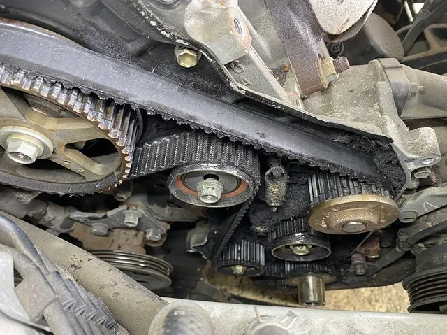各ベルトを外し、タイミングベルトカバーを外してみると内部はオイル漏れが過去にあったような感じの状態でした。切損しなくて良かった。交換タイミングもうちょっと遅かったら危なかったかも