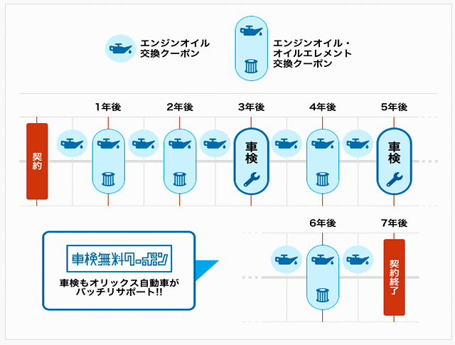 エンジンオイルは半年ごと、エレメントも1年毎(相当分)無料で交換できるクーポンが付いてきます。愛車のケアまでバッチリサポートいたします。