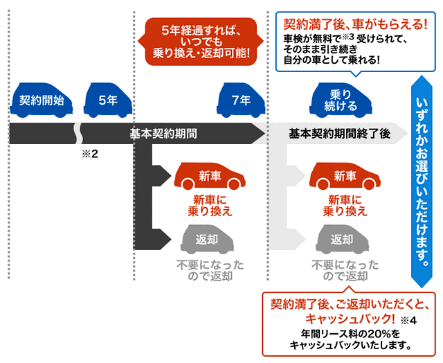 ■ 5年たったら乗り換え・返却が自由 7年後はクルマをもらうかキャッシュバック