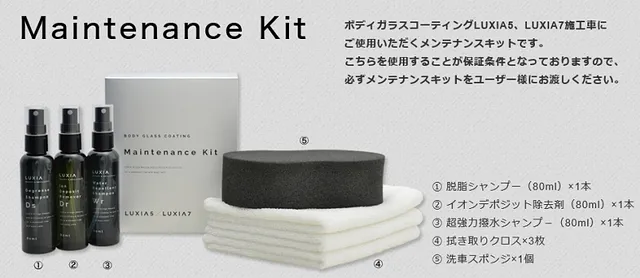 LUXIAボデイガラスコーテイングは、ボデイ光沢に対して、新車で5年間、既販車で3年間の保証期間を設けています。